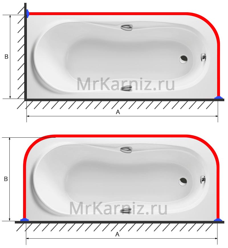 Для их изготовления нам необходимо знать лишь длину и ширину ванны. На схеме они обозначены символами "А" и "В"